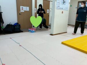 フープジャンプをしたり、段ボールタクシーで進みます。