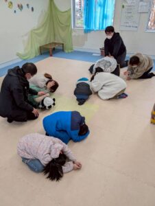 まずは「おかしもち」のお話を聞き、避難のさいの注意事項などみんなで確認をしました。